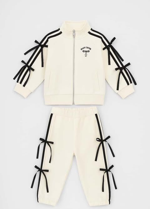 Set sportiv për vajza, prej materiali të butë pambuku në ngjyrë të bardhë kremoze. Xhaketa me mbyllje me zinxhir dhe detaje me shirita të zinj dekorativë në mëngë, që i japin një pamje moderne dhe unike. Pantalonat me bel elastik dhe të njëjtat detaje me fjongo anash për një stil të veçantë. Perfect për përditshmëri me stil dhe rehati maksimale. ✨👧